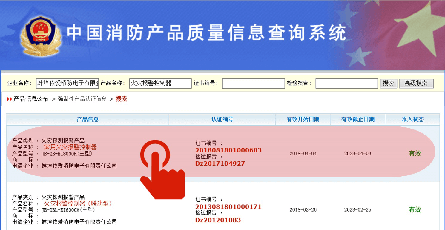 Klik pada produk yang relevan untuk memeriksa sertifikat 3C terbaru dan data laporan inspeksi, seperti klik "Home Fire Alarm Controller".